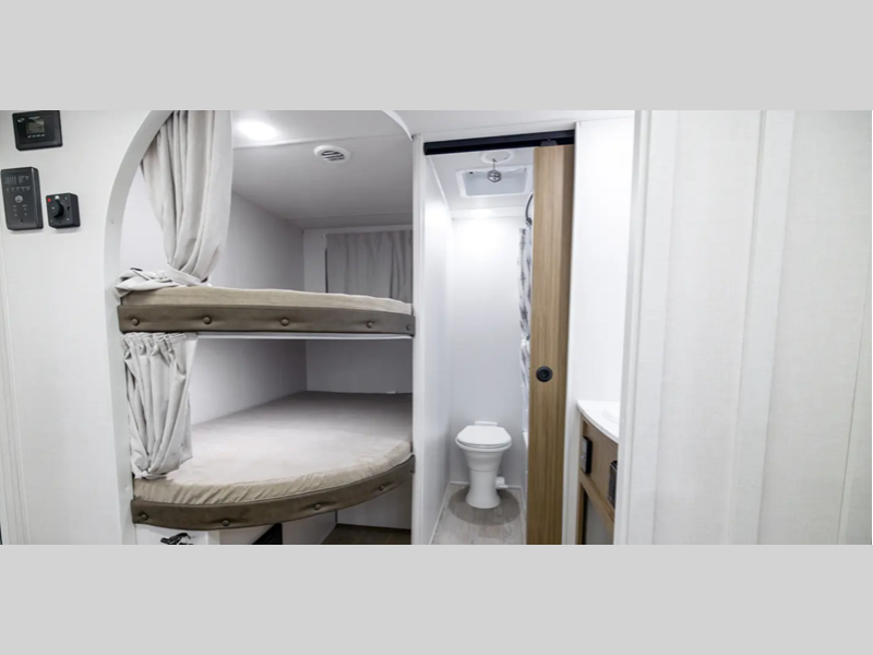 Sleeps 8 Slides 1 Length 28 ft 11 in Ext Width 8 ft Ext Height 10 ft 8 in Hitch Weight 610 lbs Dry Weight 5520 lbs Cargo Capacity 2090 lbs Fresh Water Capacity 39 gals Grey Water Capacity 74 gals Black Water Capacity 32 gals Number Of Bunks 2 Available Beds Custom King with Versa-Tilt Refrigerator Type 12V Number of Awnings 1 Water Heater Type Tankless AC BTU 13500 btu Awning Info with 4K Blade Lighting Axle Count 2 Shower Type Walk-In Shower Similar Floorplans