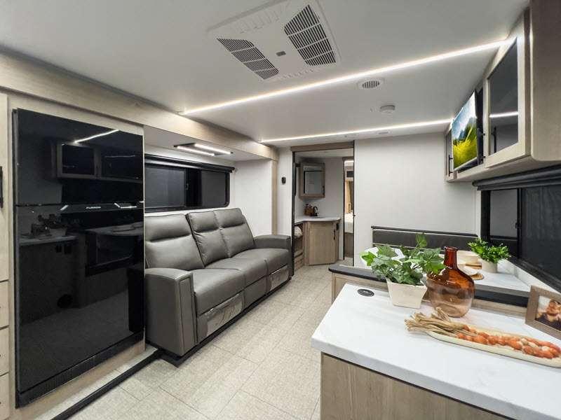 The gel-coated fiberglass exterior and one-piece roof membrane form the base that holds all of the many features, like the three-burner range with an oven, residential walk-in shower, high capacity furnace, and LED HDTV. The friction-hinge entry door won't fly away when you open it, and the residential countertops will let you set down dinner plates. There is a large panoramic window and LED lighting to keep your trailer feeling open, and the four packages included will provide even more features you won't want to camp without. Some of these features include a 200W solar panel, an accessory hitch, and a full width pass-thru storage!