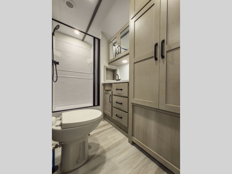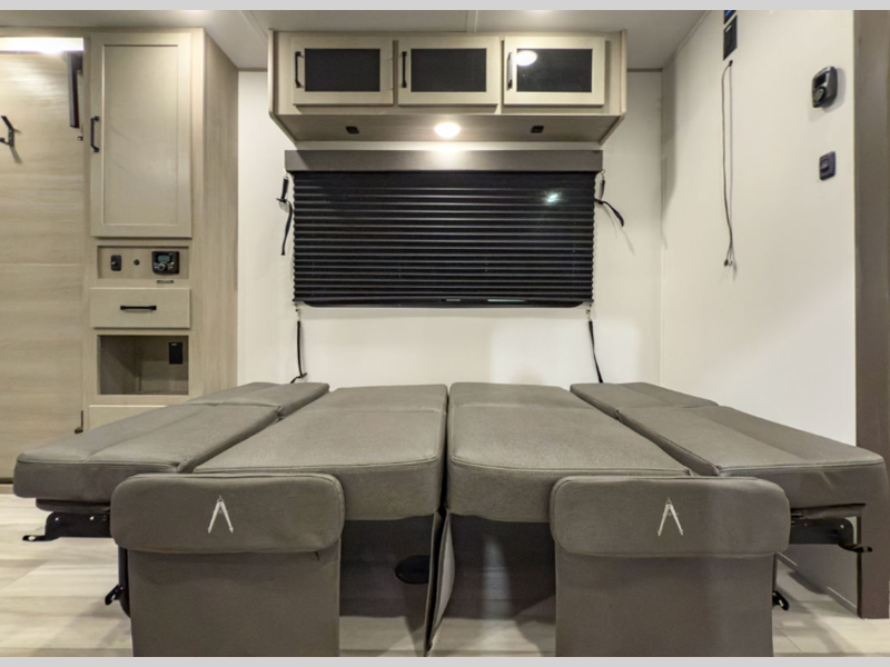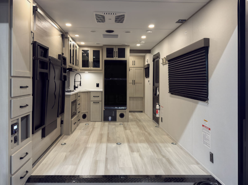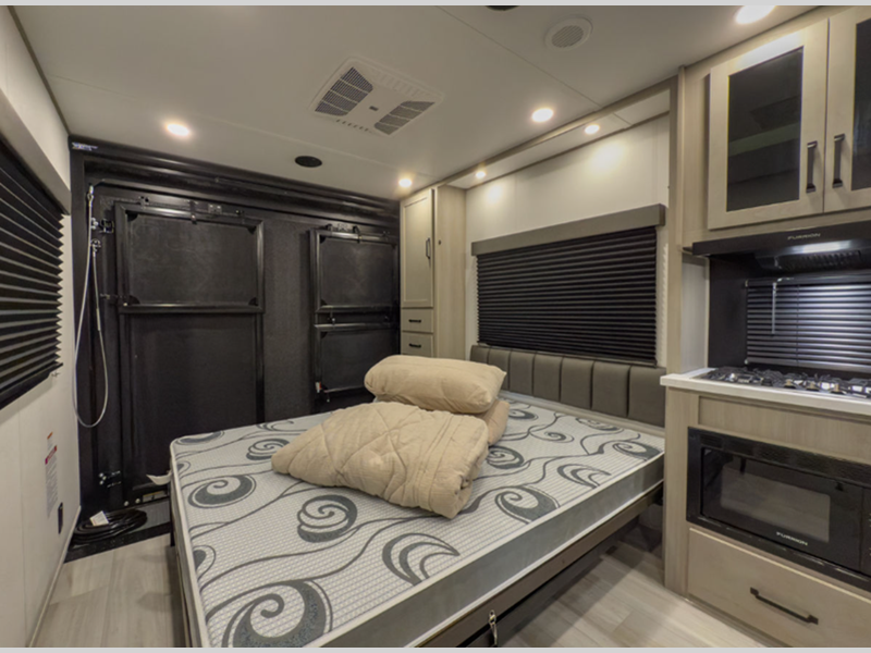 MAV stands for Momentum Adventure Vehicle, and you will surely have grand adventures in this one. The Strong Wall aluminum construction is 25% thicker than the competition and the double insulated roof is ultra durable. Thoughtful design touches make life easier, like the magnetic storage door catches and the lack of wheel wells in the garage, which gives you full use of the cargo area. Inside you'll find solid hardwood drawer fronts, residential countertops, and a solid bedroom door. The Solar Package provides off-grid capabilities with a 180W solar panel, 12V refrigerator, battery monitor, and 40 Amp charge controller with Bluetooth!