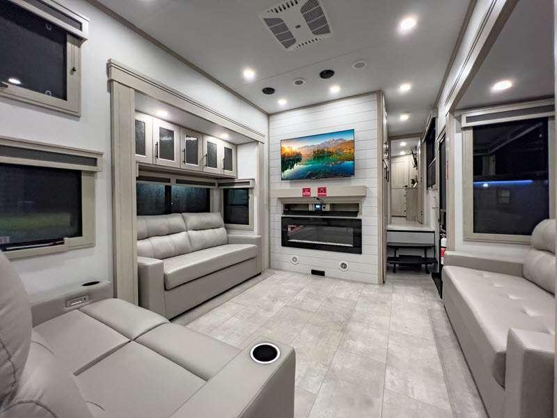 Sleeps 6 Slides 4 Length 42 ft 10 in Ext Width 8 ft 5 in Ext Height 13 ft 5 in Int Height 8 ft 1 in Exterior Color Standard Graphics or Aurora, Midnight, Pearl Full-Body Paint Options Hitch Weight 3200 lbs GVWR 23500 lbs Dry Weight 19000 lbs Fresh Water Capacity 83 gals Grey Water Capacity 159 gals Black Water Capacity 106 gals Tire Size ST215/75R 17.5 LRH Furnace BTU 35000 btu Number Of Bunks 2 Available Beds Queen Refrigerator Type Stainless Steel Refrigerator Size 20 cu ft Cooktop Burners 3 Shower Size 60" x 30" Number of Awnings 3 Axle Weight 8000 lbs LP Tank Capacity 30 lbs. Water Heater Type Tankless On Demand AC BTU 30000 btu TV Info LR LED 50" Smart TV, BR 40" TV, BNKRM 40" TV, EXT 50" TV Awning Info 15’ 5”, 7’ and 15’ 5" Power w/Integrated LED Lighting Axle Count 2 Number of LP Tanks 2 Shower Type Tub/Shower Combo Electrical Service 50 amp Similar Floorplans