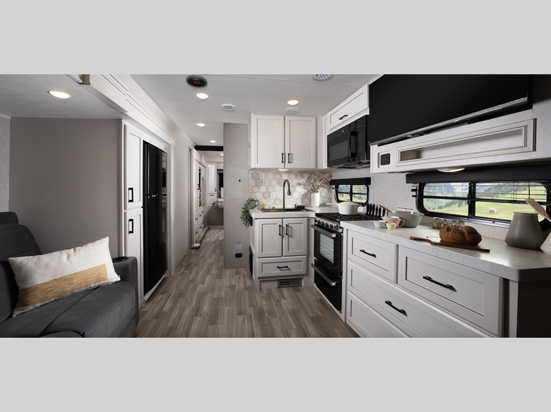 Sleeps 4 Slides 3 Length 37 ft 11 in Ext Width 8 ft 1 in Ext Height 11 ft 11 in Int Height 7 ft Interior Color Calli Linen Hitch Weight 1290 lbs GVWR 11700 lbs Dry Weight 9660 lbs Cargo Capacity 2040 lbs Fresh Water Capacity 52 gals Grey Water Capacity 74 gals Black Water Capacity 37 gals Tire Size ST235/85R16'E Furnace BTU 35000 btu Available Beds Olympic Queen Refrigerator Type 12V Refrigerator Size 10 cu ft Cooktop Burners 3 Shower Size 30" x 36" Number of Awnings 1 LP Tank Capacity 30 lbs Water Heater Type Tankless AC BTU 15000 btu TV Info LR 4K Ultra LED HD Smart TV Awning Info 14' Electric w/Integrated LED Lights Axle Count 2 Washer/Dryer Available Yes Number of LP Tanks 2 Shower Type Standard Electrical Service 50 amp Similar Floorplans