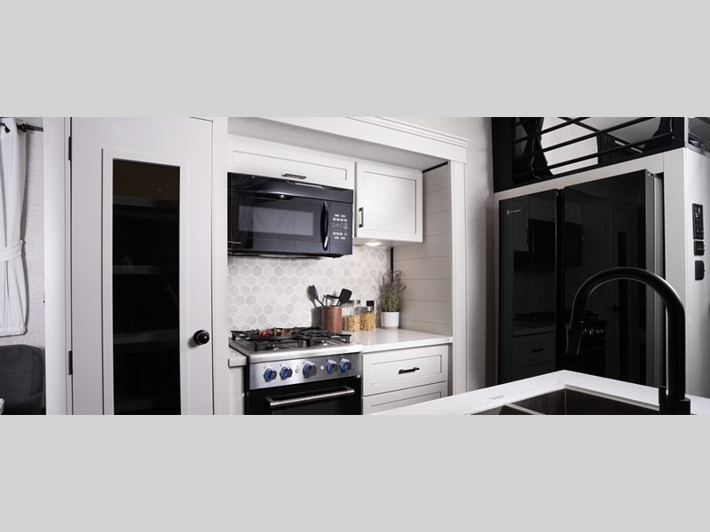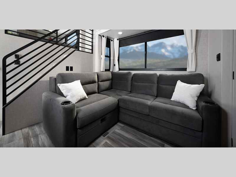 Durable construction begins with 12 inch I-Class cambered structural steel I-beams, a Magnum Truss roof system, and 5/8 inch tongue-and-groove plywood floor decking. You will appreciate the axles with electric, self-adjusting brakes and E-Z Lube hubs for smooth towing, and the insulated and enclosed underbelly within the Thermal Package will help extend your camping season. The interior will feel more like a home with hardwood look vinyl flooring, an electric fireplace, tall doorways and ceiling heights, and many more comforts.