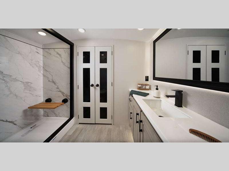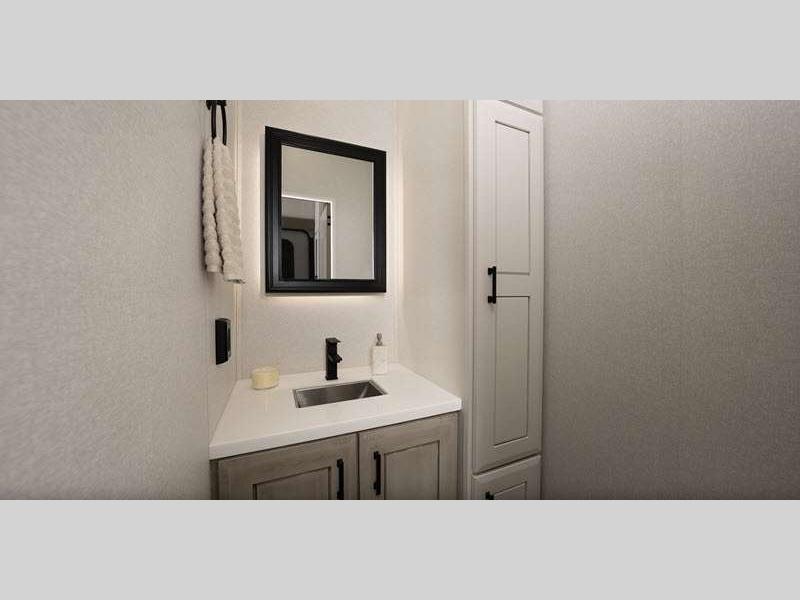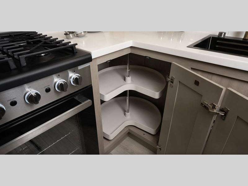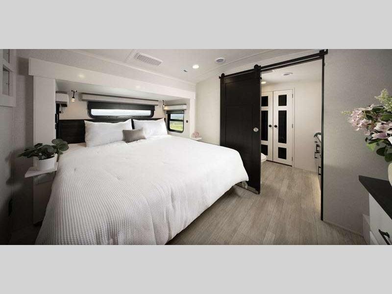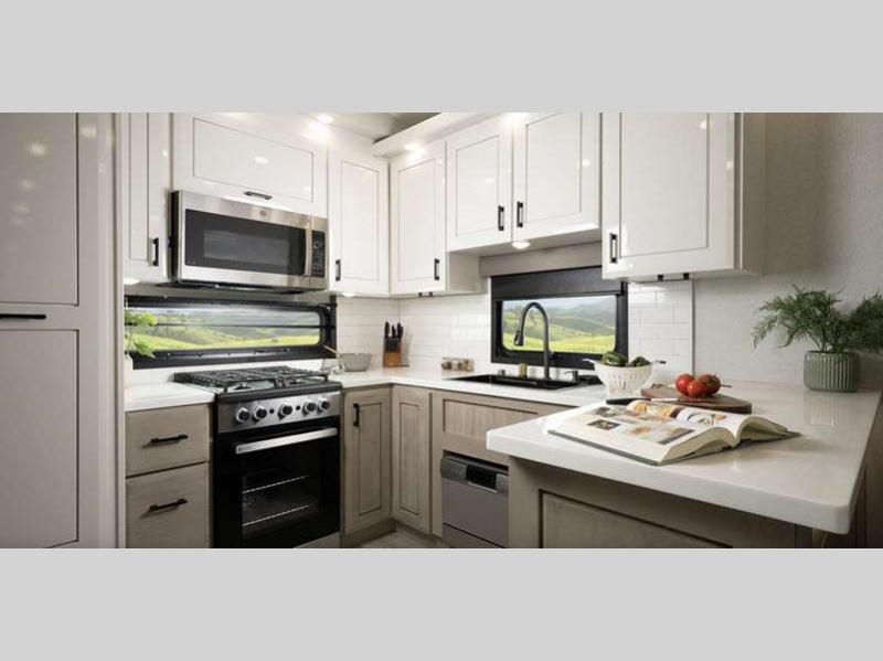 Step inside and find Residential, solid-surface kitchen and bathroom countertops paired with solid hardwood cabinetry, (made in USA) vinyl flooring, and LED accent lighting above the slide outs. You will appreciate the 102" wide body construction creating open living spaces, and each model includes a pass-through storage with Slam-Latch baggage doors so nothing needs to be left behind.
